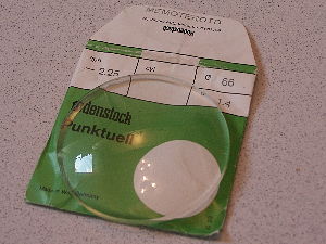 Well, quality and price of German optical instruments are legendary. I was very happy to find out that a diameter 66mm lens in -2.25 would only set me back around 16 Euros. This is for the uncoated version. There are versions with simple and double anti-reflective coating. The version with double anti-reflective coating costs 38 Euros - without any screw mount, of course. |