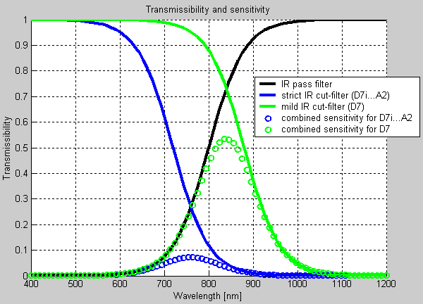 A more restrictive internal IR cut-filter lets less IR light pass. I've created the following spectral sensitivity chart. To get the combined transmissibility of two filters, you have to multiply the two transmissibility functions for each wavelength. Please be aware that this is just to give an idea. The real filters look different, but the overall relations are as shown. Furthermore, it would be necessary to include the spectral sensitivity of the CCD itself and the Bayer Filter as well. But as I do not have any data for Bayer colour-filter arrays beyond 750nm/800nm, this was not possible.