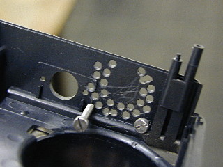 When disassembling your C-x0y0 make sure to remove the front cover completely from the rest of the camera. This includes remving the PC sync connector. This way dust created by the drilling will